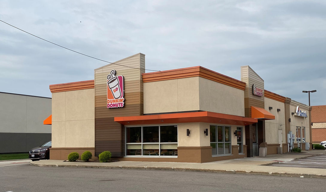 The Dunkin' Donuts & Retail development in Medina represents a modern adaptation of the national brand’s updated prototype, combining efficient service-oriented design with regional contextual integration. The Dunkin' end features enhanced branding elements such as bold canopy accents, a parapet-mounted logo, and a vertical tower volume that anchors the drive-thru side. Large glazed openings along the customer seating zone provide natural light.